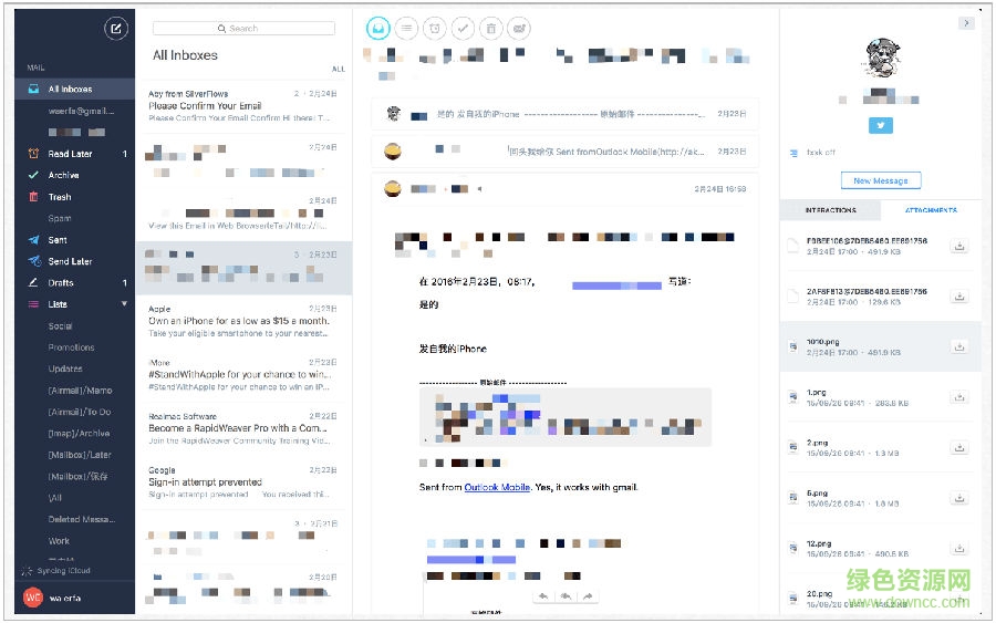 2.與聯(lián)系人的往來(lái)郵件你可以在郵件列表中翻閱,也可以在聯(lián)系人信息欄里查看,此外還能查閱與其通信郵件中所有的附件內(nèi)容,超級(jí)便利。