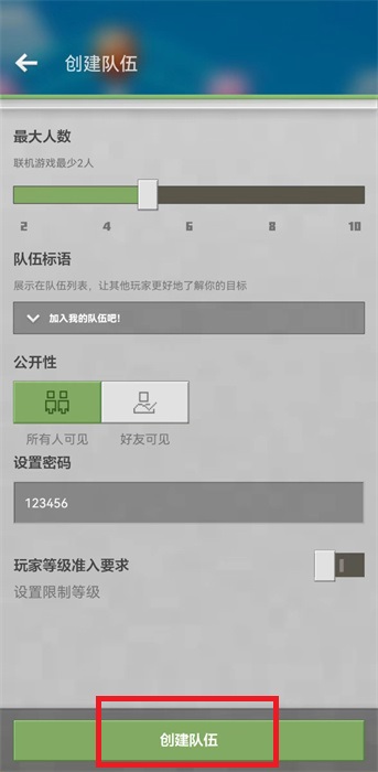 4、在這個(gè)創(chuàng)建隊(duì)伍的界面中,可以選擇創(chuàng)建的人數(shù)、公開性還有密碼,有了密碼別人就不會(huì)加入了,點(diǎn)擊下方的【創(chuàng)建隊(duì)伍】進(jìn)入到房間中;