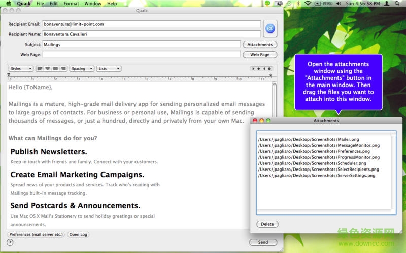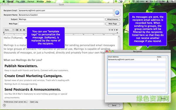 Quaik Mac版可以通過讀取聯(lián)系人目錄來批量輸入目標郵箱地址,很方便的附件添加方式,可對郵件正文進行富文本編輯,幫助mac用戶批量輸入目標郵箱地址,支持任何類型的附件添加、個性化模板標簽添加等。