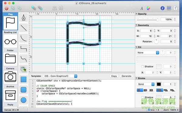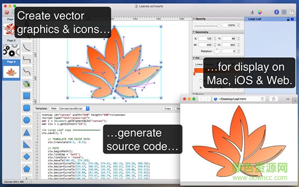 Schwartz Mac版是Mac平臺(tái)的繪圖代碼編寫工具,你可以創(chuàng)建一個(gè)用戶友好的所見即所得的環(huán)境下基于圖形組成的向量,然后自動(dòng)生成源代碼,讓這些內(nèi)容在iOS,OS X或是Web端顯示。