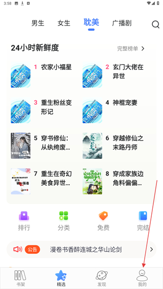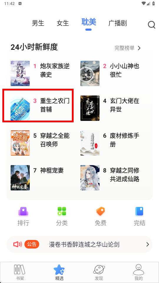 1、打開連城讀書進入精選頁面,切換到想看的分類,找到感興趣小說重生之農(nóng)門首輔并點擊進入閱讀。