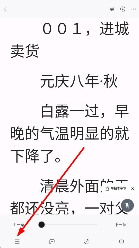 2、在小說閱讀界面,點擊左下角三條橫線樣式的按鈕彈出目錄。