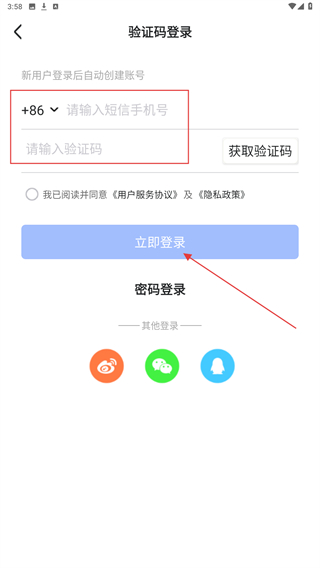 3、輸入短信手機號、驗證碼后,點擊立即登錄即可。