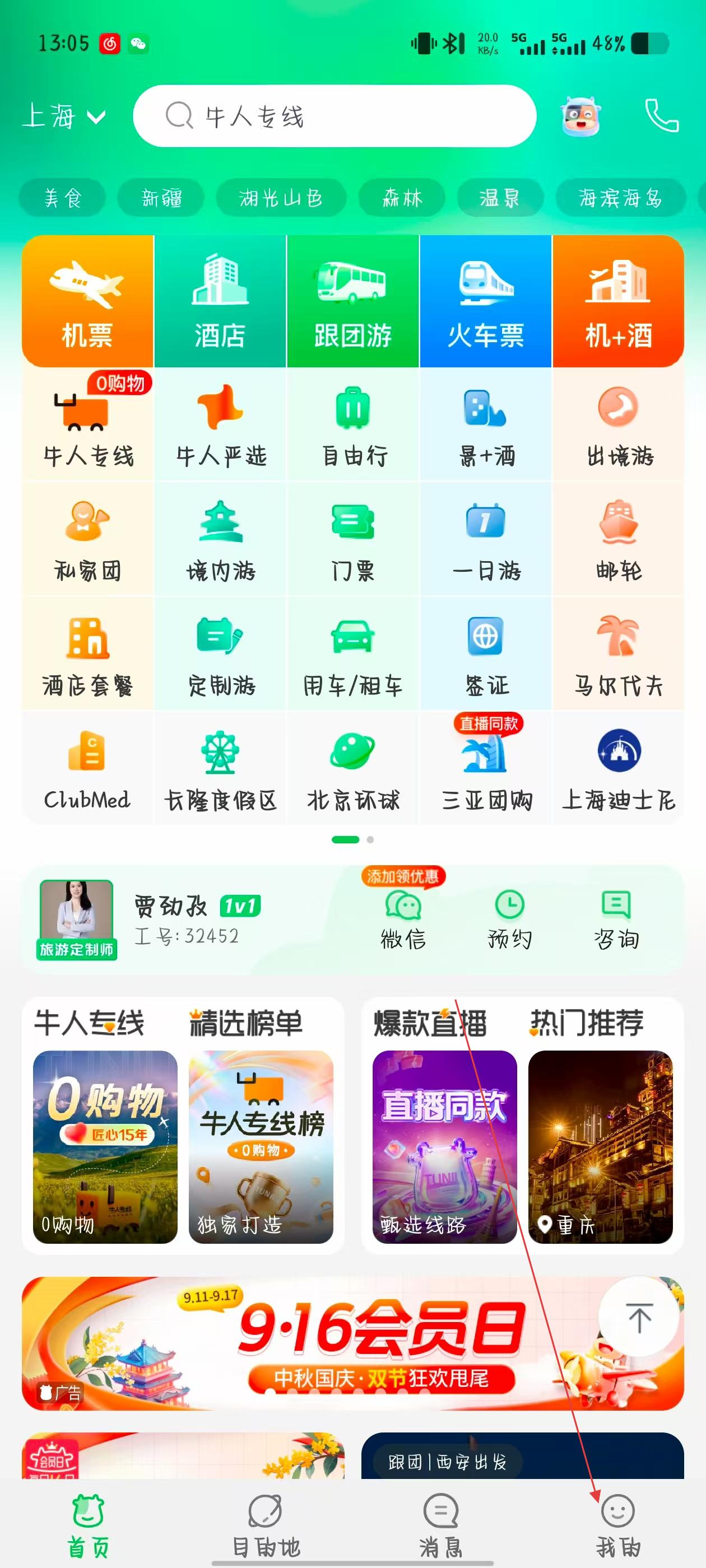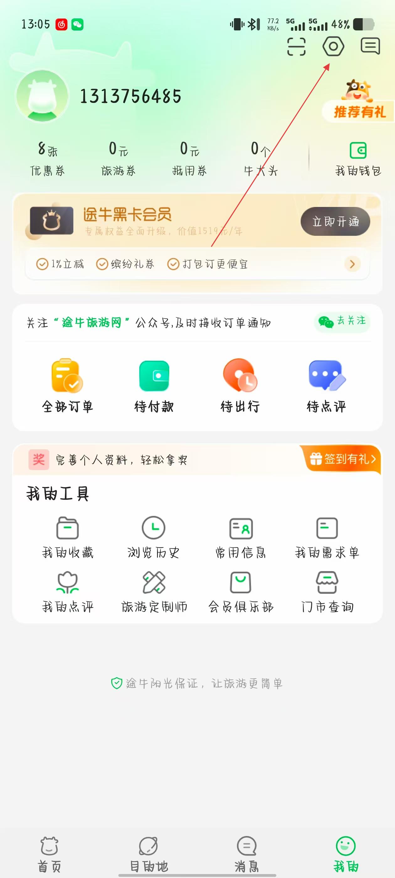 1、打開途牛旅游APP,點(diǎn)擊頁面右下角我的,進(jìn)入個(gè)人中心頁面。