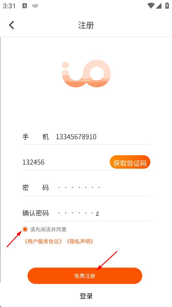 4、勾選請先閱讀并同意用戶服務(wù)協(xié)議和隱私聲明,確認(rèn)信息無誤后,點(diǎn)擊免費(fèi)注冊按鈕。