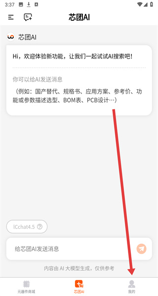 1、打開芯團(tuán)AI APP,進(jìn)入芯團(tuán)AI頁面后,點(diǎn)擊底部我的選項(xiàng),進(jìn)入登錄頁面。