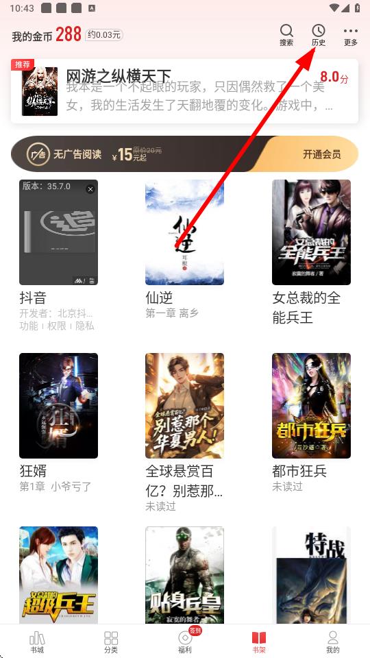2、在書(shū)架頁(yè)面右上角找到歷史圖標(biāo)并點(diǎn)擊。