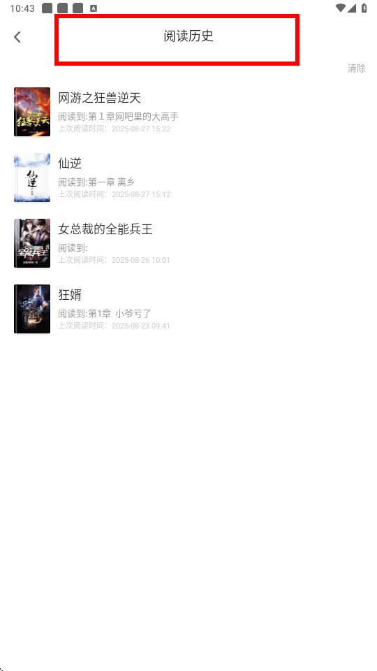 3、進(jìn)入后即可查看閱讀歷史記錄,其中會(huì)顯示閱讀書(shū)籍的名稱、閱讀進(jìn)度以及上次閱讀時(shí)間等信息。