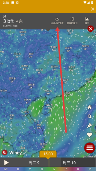 1、在進(jìn)入到windy應(yīng)用中,可以點(diǎn)擊該地點(diǎn)的預(yù)報(bào)按鈕,查看當(dāng)?shù)靥鞖忸A(yù)報(bào)。