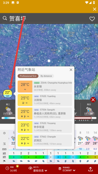 4、點(diǎn)擊箭頭指向處按鈕,可以查看附近的氣象站信息。