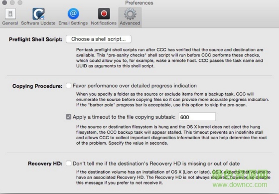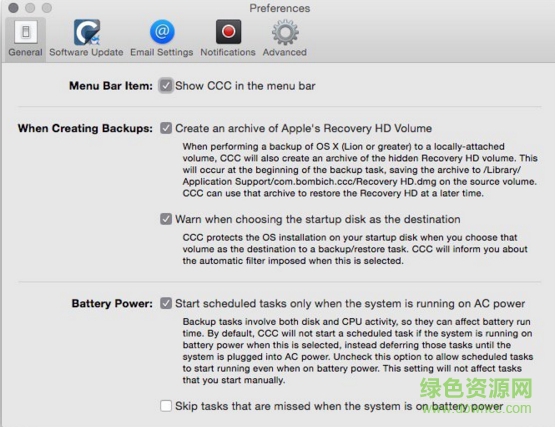 2.Carbon Copy Cloner 的偏好設(shè)置中,可以選擇是否在菜單欄中顯示圖標(biāo),是否創(chuàng)建蘋果恢復(fù)分區(qū)的備份等。最后還可以只在 Mac 連接電源時進行備份。高級工下,可以選擇腳本完成任務(wù),需要有一定的編程基礎(chǔ)。一般用戶使用不到。Carbon Copy Cloner的功能很簡單,整體備份過程很平穩(wěn),適合一次性全盤備份。