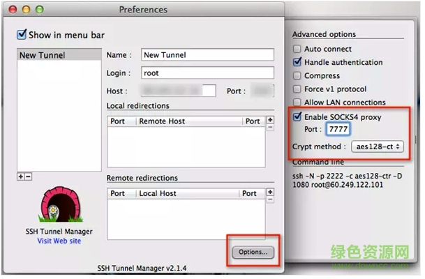 2.再單擊「Options」將「Enable Socks4 proxy」勾選起來(lái),下面設(shè)定要使用的轉(zhuǎn)接連接埠(可自定義一個(gè)),然后選擇aes128加密。設(shè)定完后關(guān)閉這個(gè)設(shè)定視窗即可。