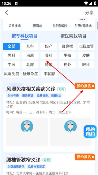3、在義診項目選擇頁面,選擇專科和具體義診項目,點擊預約報名。