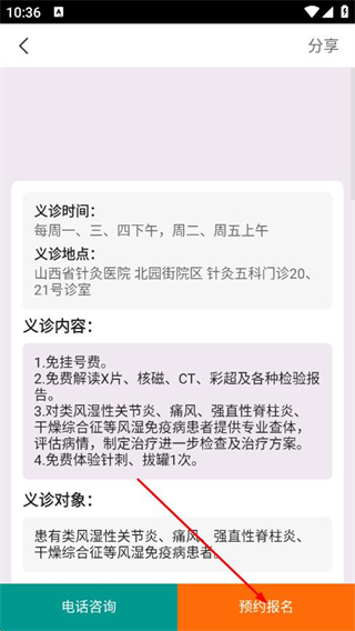 4、進入義診詳情頁面后,再次點擊預約報名,即可完成義診預約。