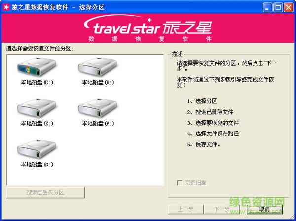 旅之星專業(yè)數(shù)據(jù)恢復(fù)下載是一款超好用的數(shù)據(jù)恢復(fù)軟件,這款軟件能夠幫助用戶快速找回丟失的文件,擁有超強(qiáng)大的數(shù)據(jù)恢復(fù)功能,快速幫你找回因誤丟失的文件,需要用到這款軟件的朋友就趕快來綠色資源網(wǎng)下載使用吧!