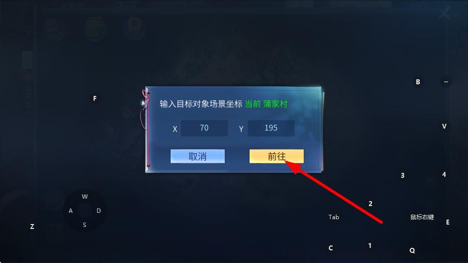 3、彈出坐標(biāo)輸入框后,確認(rèn)坐標(biāo)點(diǎn)擊前往按鈕,角色即可自動(dòng)尋路前往目標(biāo)地點(diǎn)。