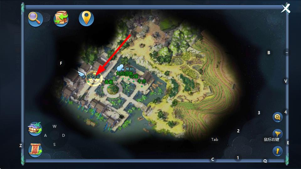2、在大地圖界面可查看場(chǎng)景中各個(gè)地點(diǎn)位置,點(diǎn)擊目標(biāo)地點(diǎn)標(biāo)識(shí)如白云觀等。