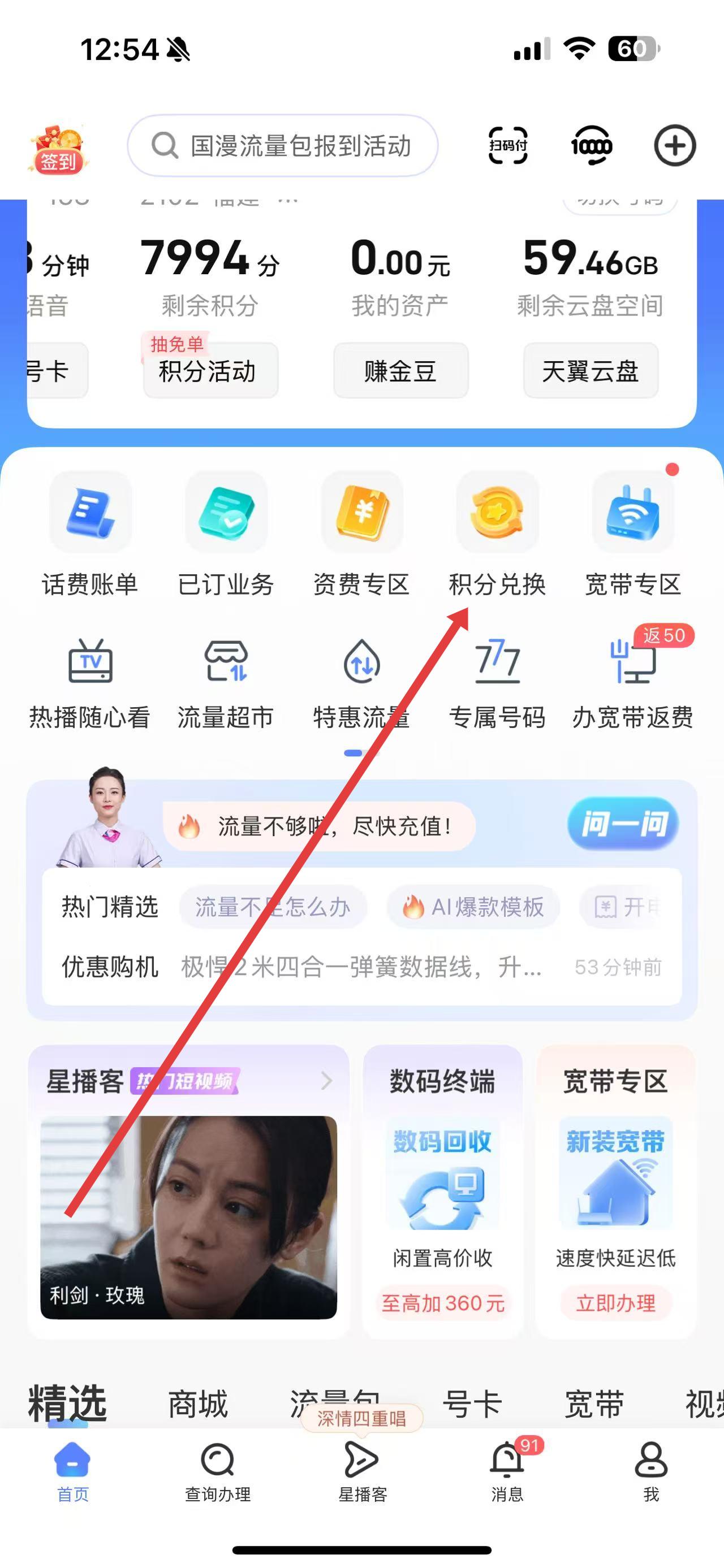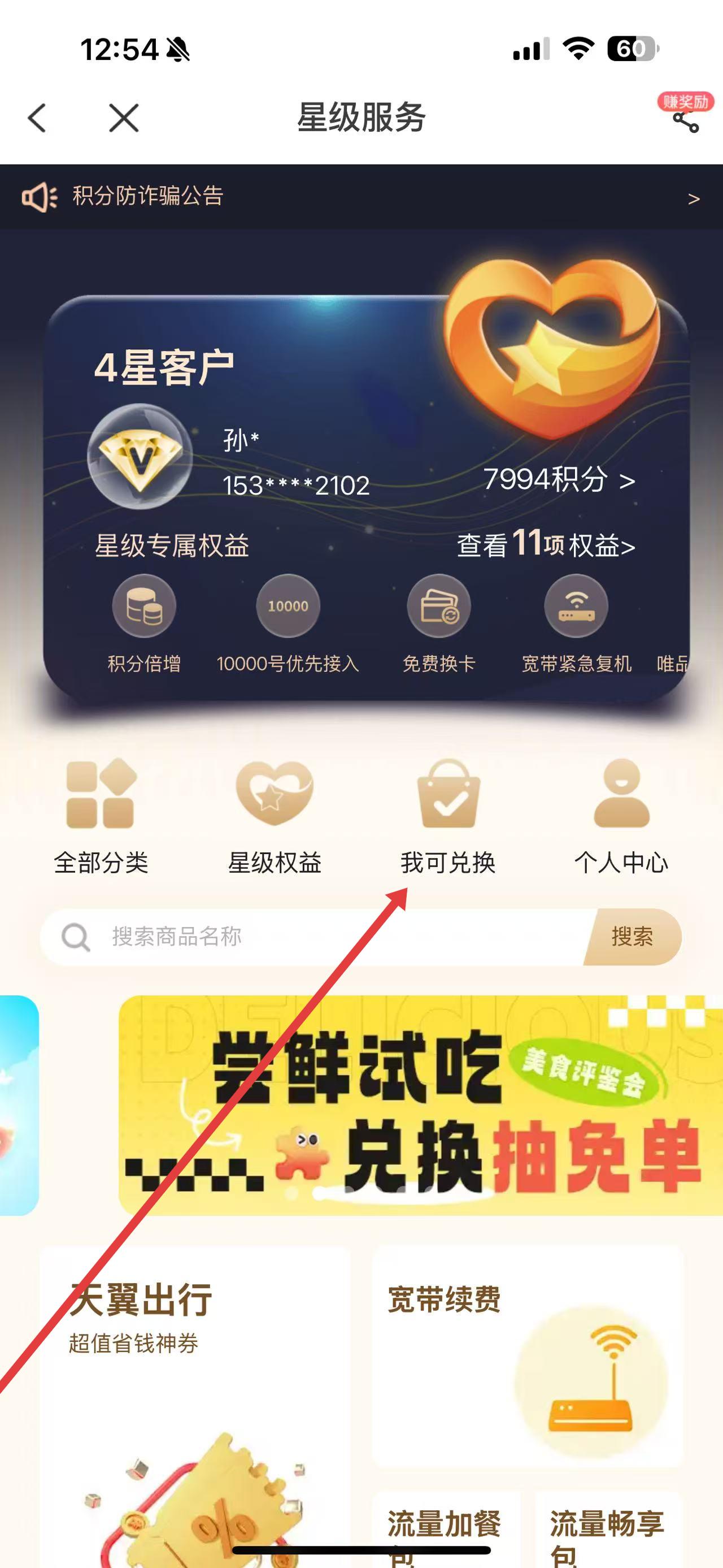 1、打開中國(guó)電信APP,進(jìn)入首頁,在上方功能區(qū)找到并點(diǎn)擊積分兌換選項(xiàng),進(jìn)入星級(jí)服務(wù)頁面。