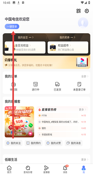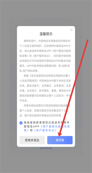 1、在打開中國(guó)電信APP后,可以點(diǎn)擊彈窗中的我同意按鈕,進(jìn)入使用。