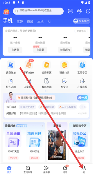 2、在進(jìn)入到中國(guó)電信首頁后,可以點(diǎn)擊右下角我按鈕,進(jìn)入我的主頁中。