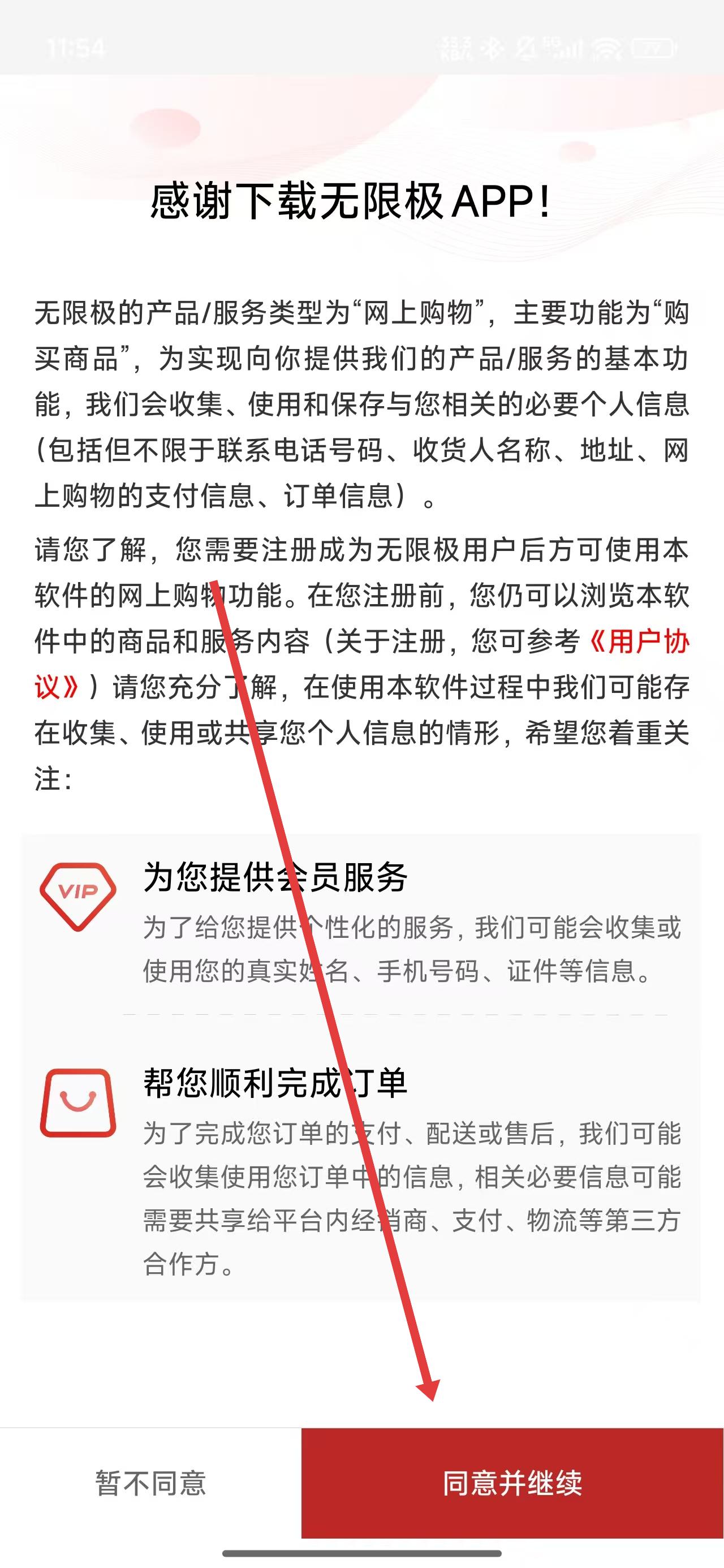 1、打開無極限app,點(diǎn)擊屏幕中的同意并繼續(xù)按鈕后,進(jìn)入使用。