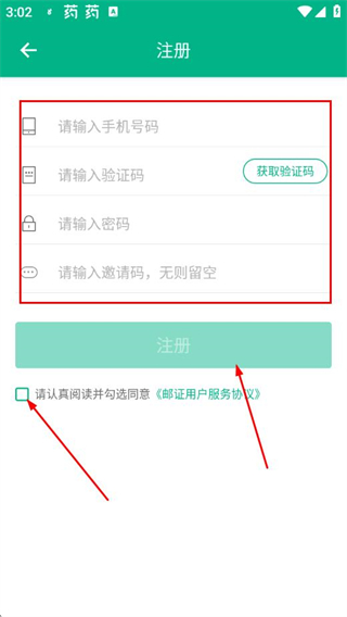 4、輸入手機(jī)號(hào)碼,和輸入驗(yàn)證碼,設(shè)置密碼,邀請(qǐng)碼選填,勾選協(xié)議后,點(diǎn)擊注冊(cè)。