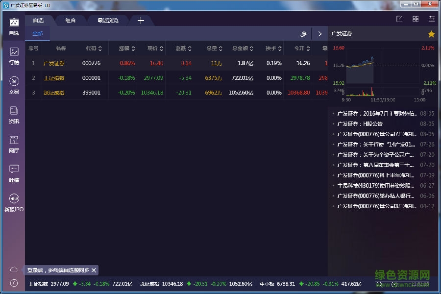 廣發(fā)證券至易版是廣發(fā)證券官方推出的一款電腦端交易中心,支持客戶們的自選股航意查看、在線快速交易、資訊新股獲知和股民吐槽等,是購買廣發(fā)證券的客戶的實用看盤軟件,綠色資源網(wǎng)歡迎大家下載使用!
