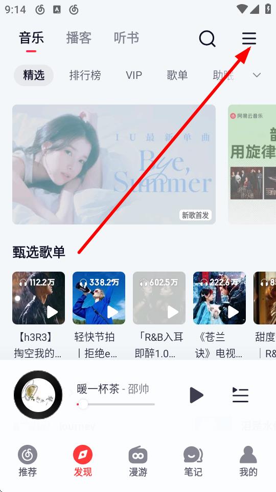 1、打開網(wǎng)易云音樂App點(diǎn)擊首頁,右上角三圖標(biāo)開側(cè)邊欄。