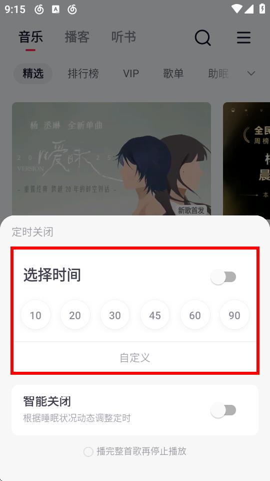 3、在定時(shí)關(guān)閉界面可選擇10、20、30、45、60、90分鐘這些預(yù)設(shè)時(shí)間,也能點(diǎn)擊自定義。
