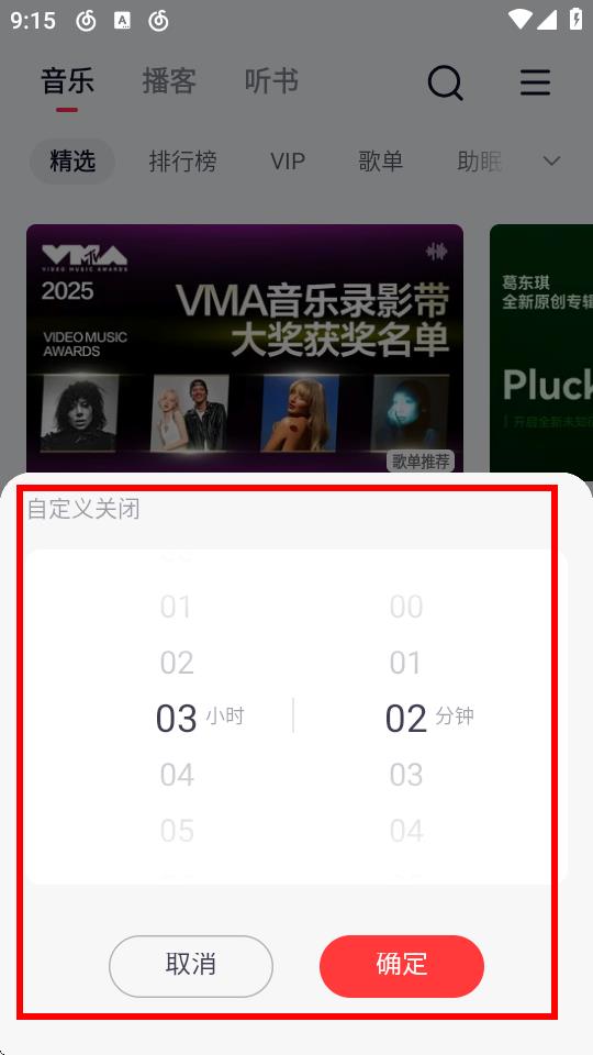 4、點(diǎn)擊自定義后設(shè)置具體小時(shí)和分鐘數(shù),設(shè)置好后點(diǎn)擊確定即可完成定時(shí)關(guān)閉音樂設(shè)置。