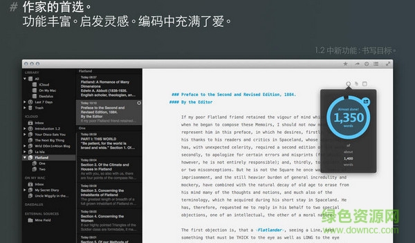 Ulysses Mac版是蘋果電腦上的一款寫作軟件,支持PDF、DOC、RTF、TXT、HTML、ePub等格式文件的編輯,貼心而周到的菜單功能,讓你的寫作更有效率和激動,歡迎作家和編輯等文學(xué)從事者來綠色資源網(wǎng)下載哦!