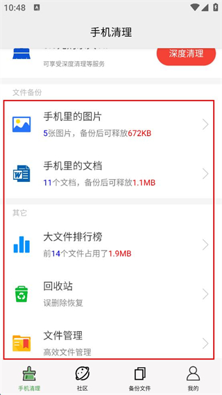 4、可選擇手機里的圖片、文檔、大文件排行榜、回收站、文件管理等功能進行操作。