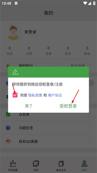 2、在我的頁面,點擊未登錄,勾選同意隱私政策和用戶協(xié)議,點擊授權(quán)登錄。