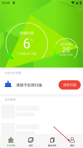 3、登錄后返回手機清理頁面,可進行垃圾文件清理授權(quán)掃描。