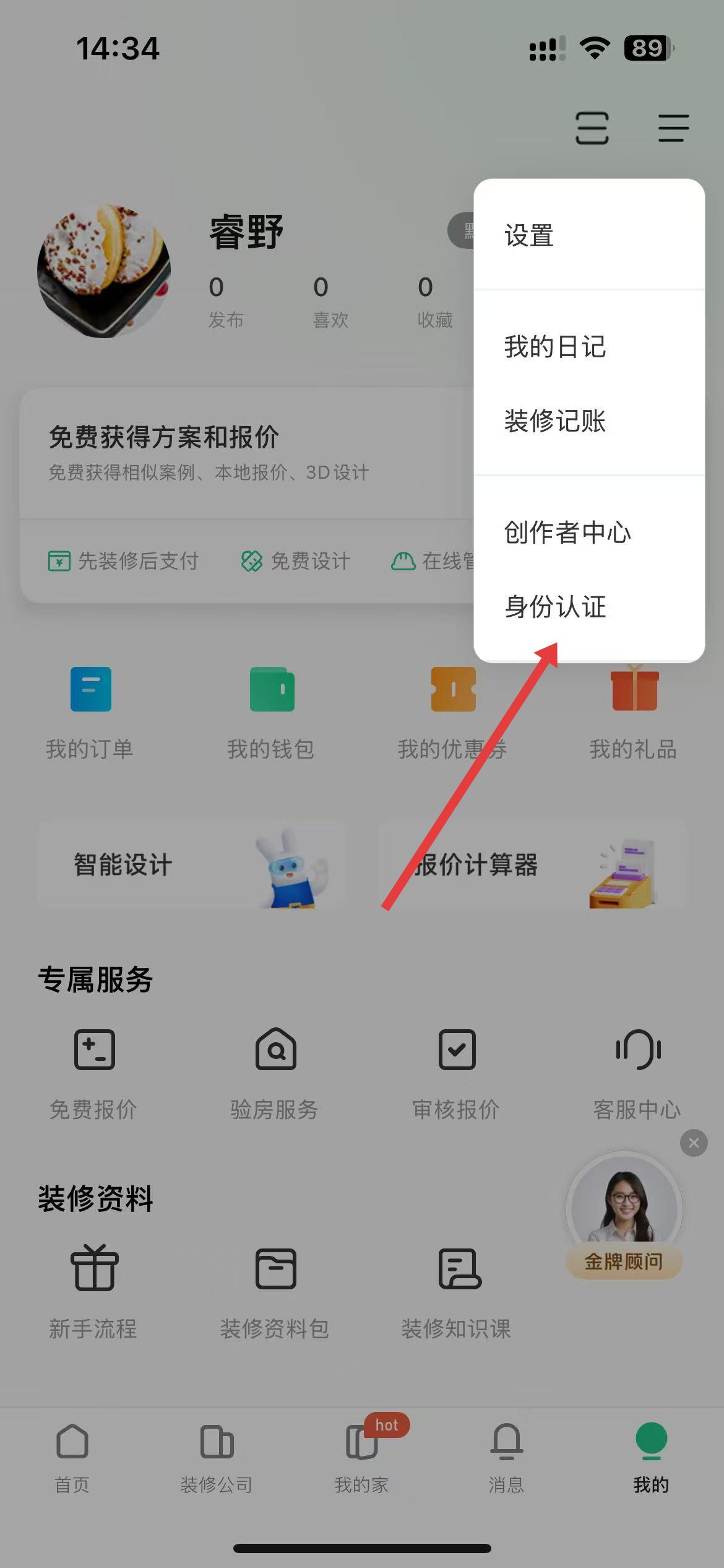 1、打開土巴兔APP,點(diǎn)擊底部導(dǎo)航欄中的我的選項(xiàng),在個(gè)人頁(yè)面右上角,點(diǎn)擊菜單圖標(biāo)。