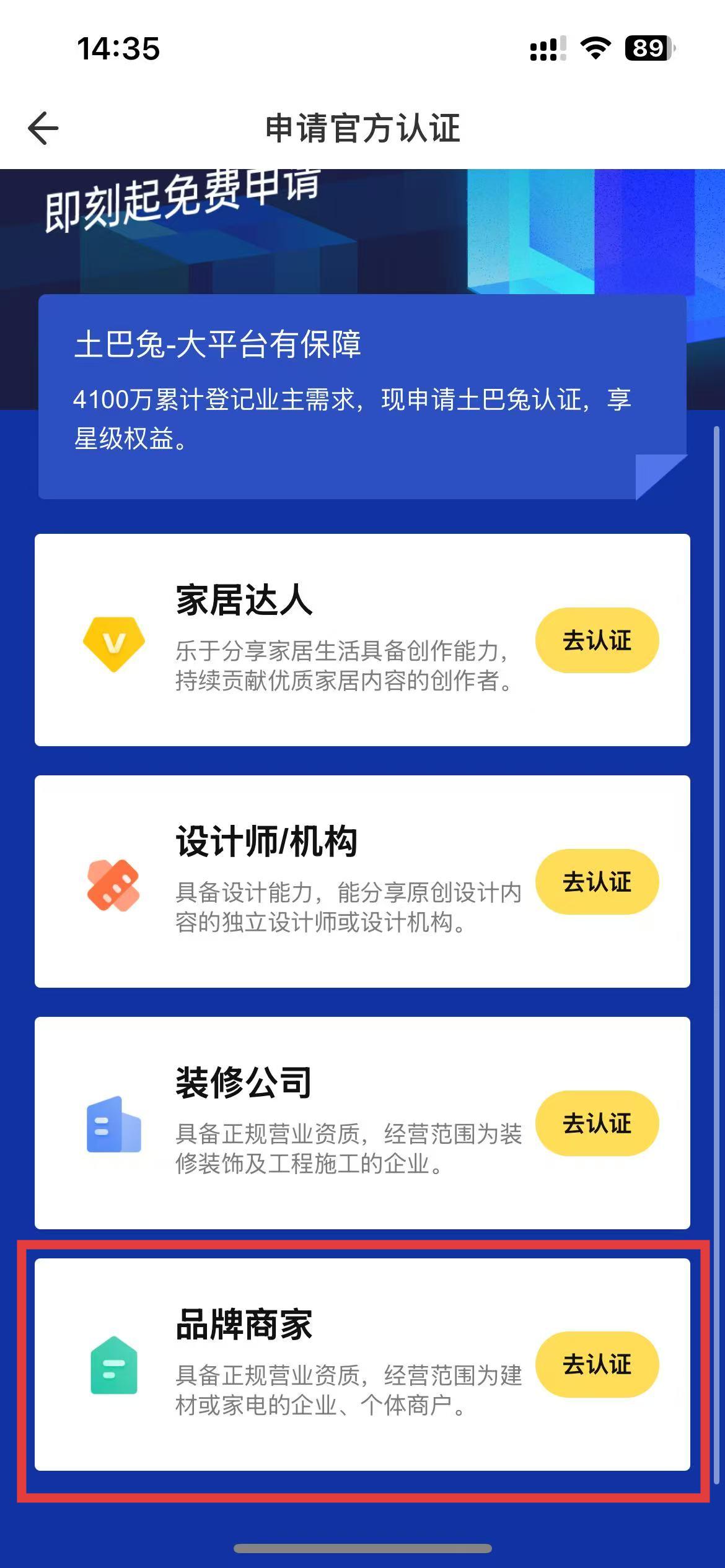 3、進(jìn)入申請(qǐng)官方認(rèn)證頁(yè)面后,在下方找到品牌商家板塊,點(diǎn)擊右側(cè)的去認(rèn)證按鈕。