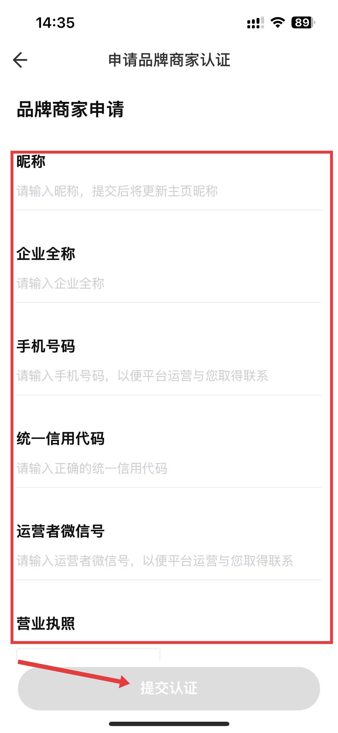4、在申請(qǐng)品牌商家認(rèn)證頁(yè)面,依次填寫信息,并上傳營(yíng)業(yè)執(zhí)照,確認(rèn)無誤后點(diǎn)擊提交認(rèn)證,等待平臺(tái)審核通過即可完成入駐。