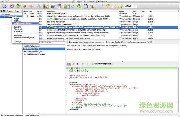 TortoiseHg mac版是一款可視化代碼控制和管理平臺,是能幫助用戶方位本地資源庫進行數(shù)據(jù)修改和提交的軟件,幫助代碼程序員們更好的進行工作。需要的小伙伴快來綠色資源網(wǎng)下載吧!