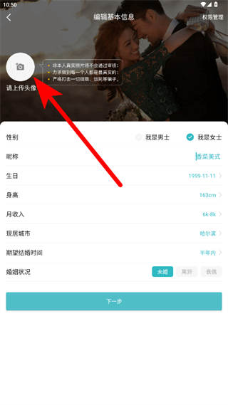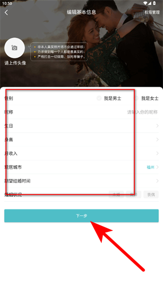 4、依次填寫性別、昵稱、生日、身高、月收入、現(xiàn)居城市、期望結(jié)婚時(shí)間、婚姻狀況等信息,填寫完成后點(diǎn)擊下一步,完成注冊與信息編輯。