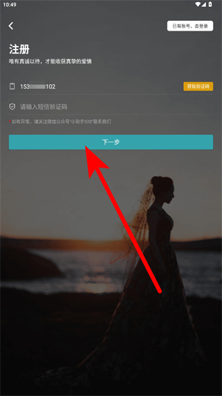 2、在注冊頁面輸入手機(jī)號,獲取并填寫短信驗(yàn)證碼后,點(diǎn)擊下一步。