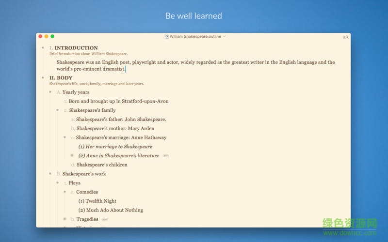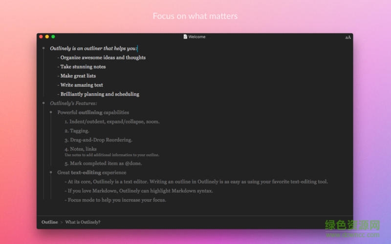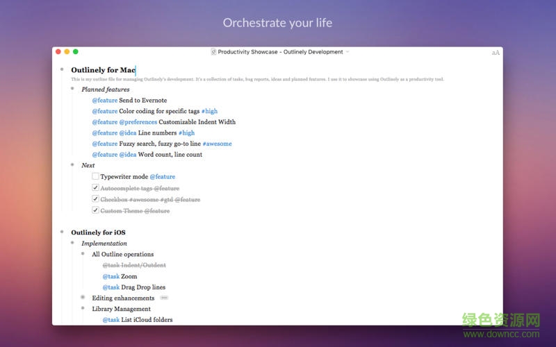 Outlinely Express mac版是一款幫蘋果電腦用戶智能整理筆記、計(jì)劃、項(xiàng)目等文檔的工具,還能輔助大家更好的玩游戲,通過目錄和大綱管理讓你更了解自己文檔的細(xì)節(jié)和內(nèi)容,為你的寫作和文字編輯保駕護(hù)航,綠色資源網(wǎng)歡迎大家下載體驗(yàn)!