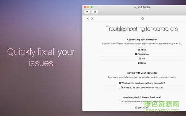 Joystick Doctor mac版是一款Joystick的游戲手柄驅動,幫助蘋果電腦的用戶更高效的連接xbox、PlayStation和Wii控制器、操縱桿和任何一種游戲手柄,給你最佳游戲體驗。綠色資源網(wǎng)首發(fā),歡迎下載體驗!