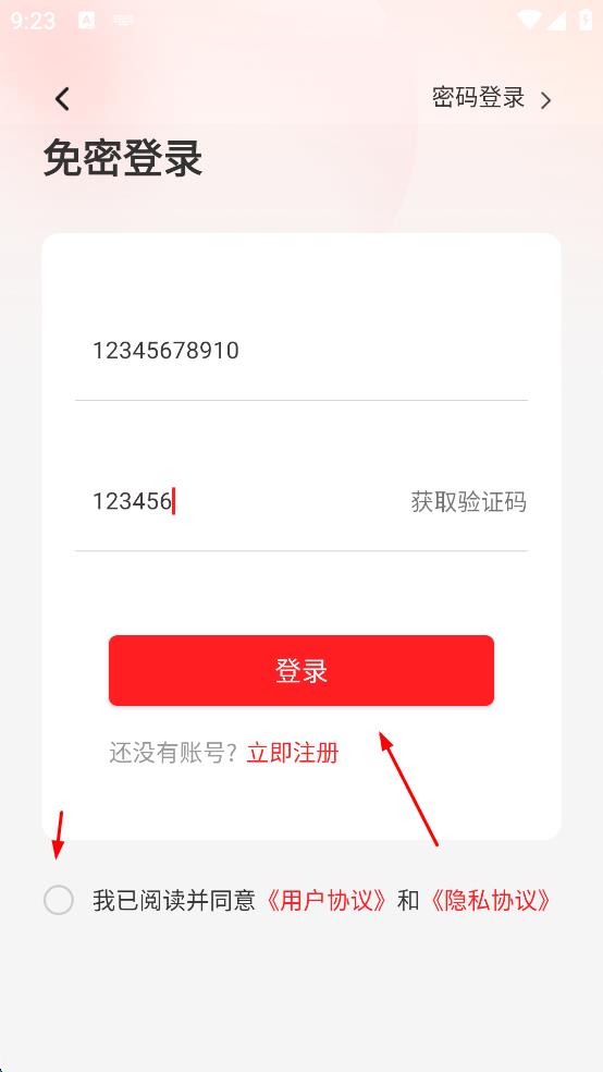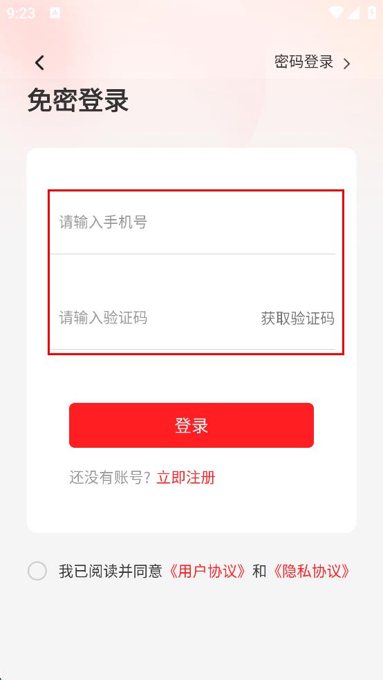 3、在登錄界面,選擇免密登錄方式,依次輸入手機號和驗證碼,完成信息填寫。