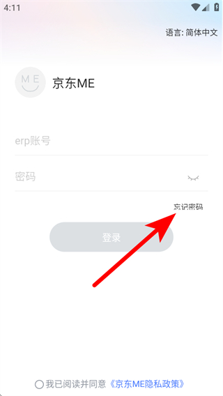 1、打開京東ME APP的登錄界面,需要點擊忘記密碼按鈕。