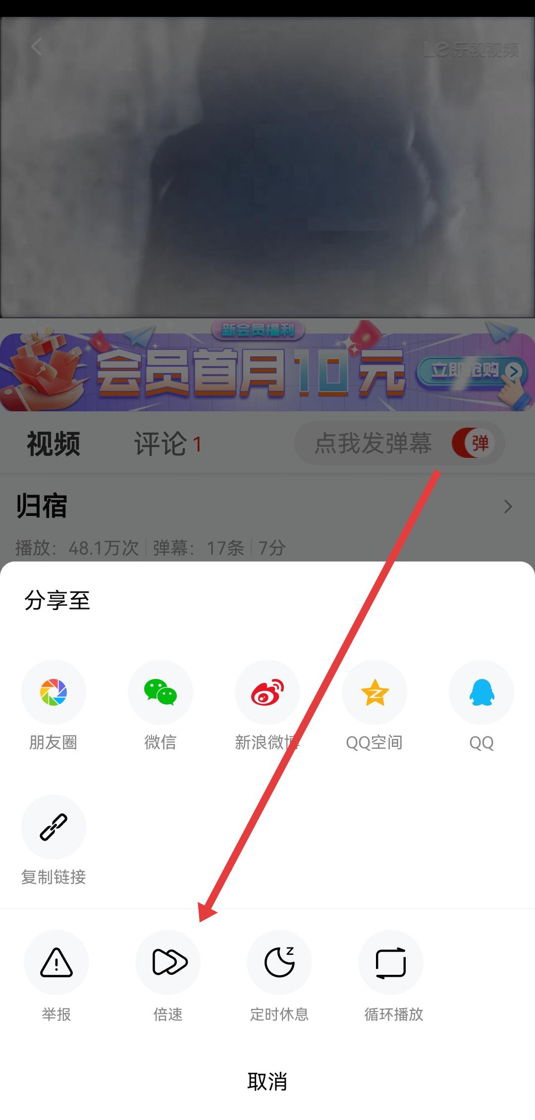 2、在彈出的操作菜單中,找到并點擊倍速的選項,調(diào)出倍速選擇的列表。