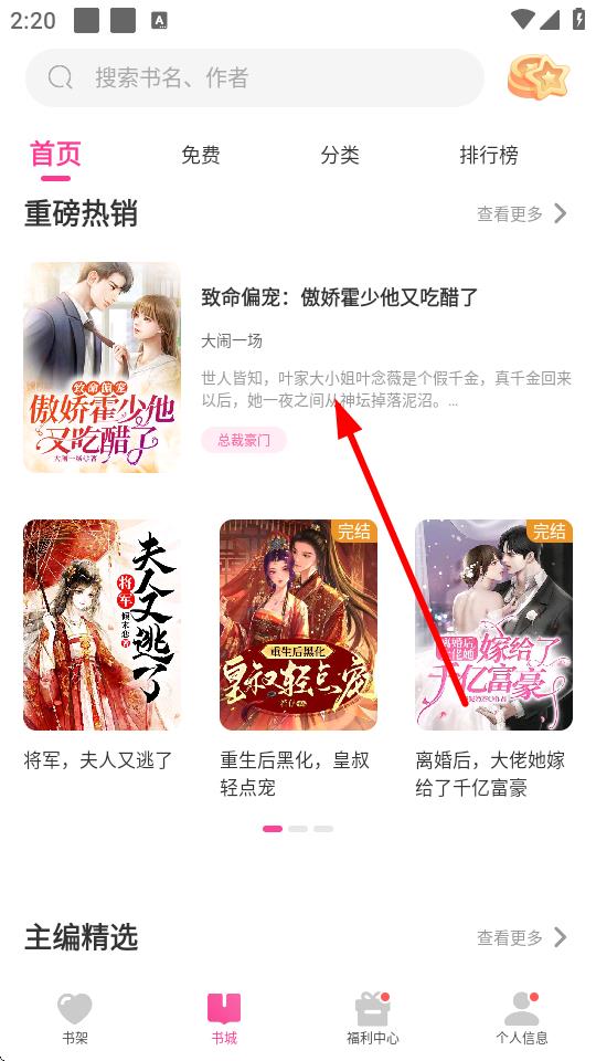 2、在書(shū)城頁(yè)面,瀏覽找到想閱讀的小說(shuō),比如點(diǎn)擊致命偏寵:傲嬌霍少他又吃醋了。