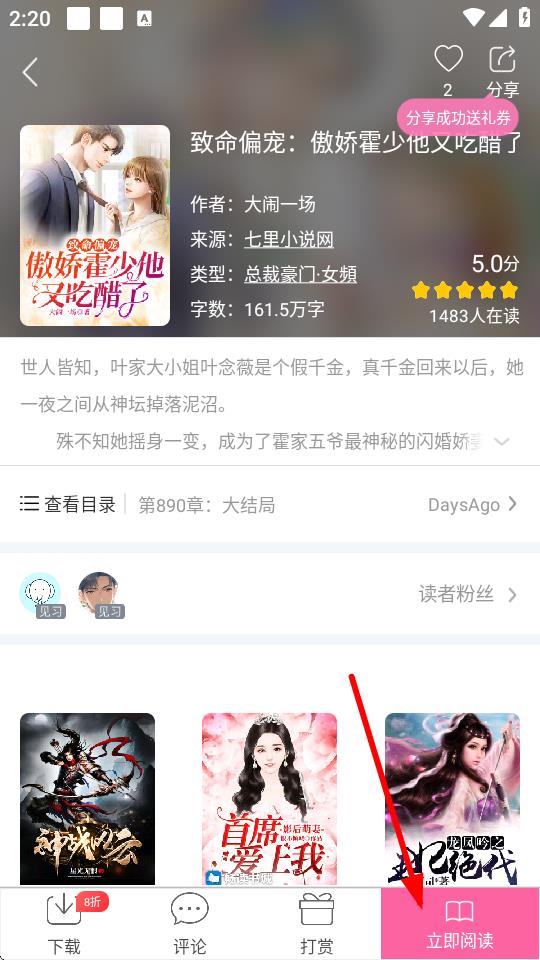3、進(jìn)入書(shū)籍詳情頁(yè)后,點(diǎn)擊右下角立即閱讀按鈕。