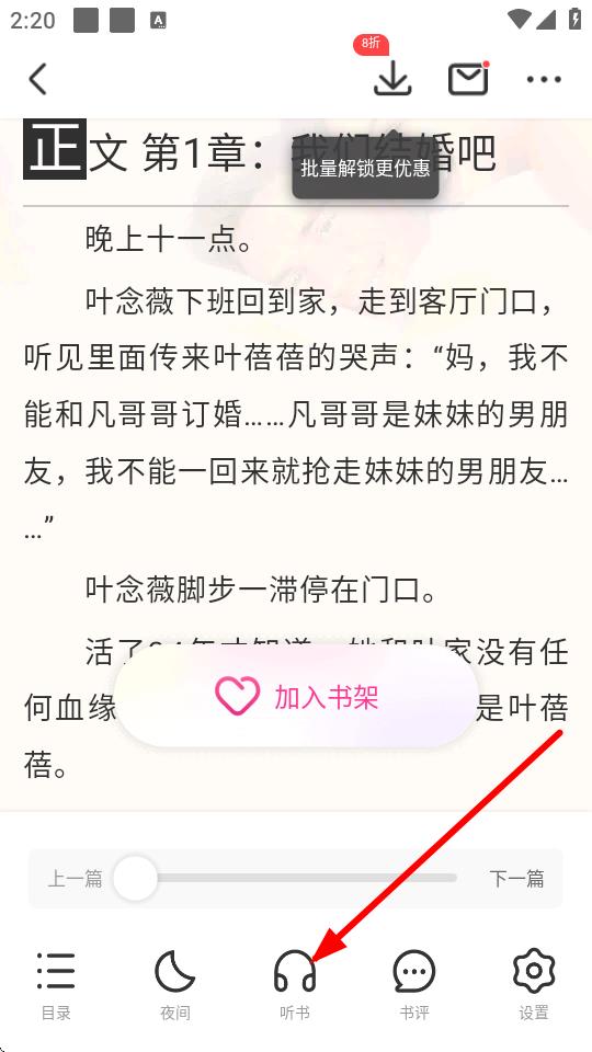 4、在小說(shuō)閱讀界面,點(diǎn)擊底部導(dǎo)航欄中的聽(tīng)書(shū)圖標(biāo),圖標(biāo)長(zhǎng)得像個(gè)耳機(jī),就能開(kāi)始聽(tīng)書(shū)了。