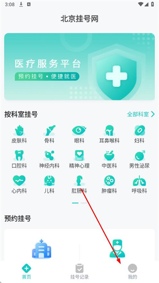 1、打開北京掛號網(wǎng)app,進入首頁,點擊底部導(dǎo)航欄中的我的選項。