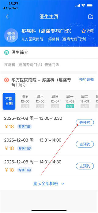 5、在醫(yī)生排班頁面選擇可預約的時段,點擊對應時段的去預約,完成掛號流程。